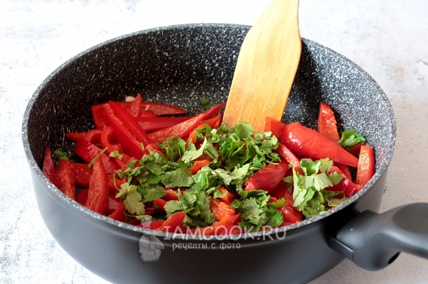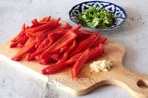 Перец очистите от плодоножек и семечек, нарежьте крупной соломкой. Кинзу или другую зелень порубите произвольно. Чеснок просто нарежьте.