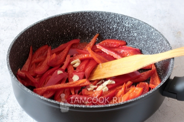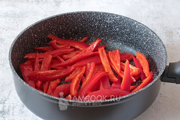 В малом количестве масла обжарьте перец 5 минут при постоянном помешивании. Сковорода должна быть антипригарной. Для обычной сковороды требуется побольше масла, что мне не очень нравится.