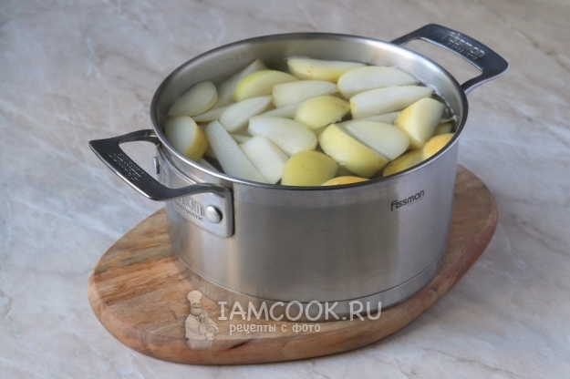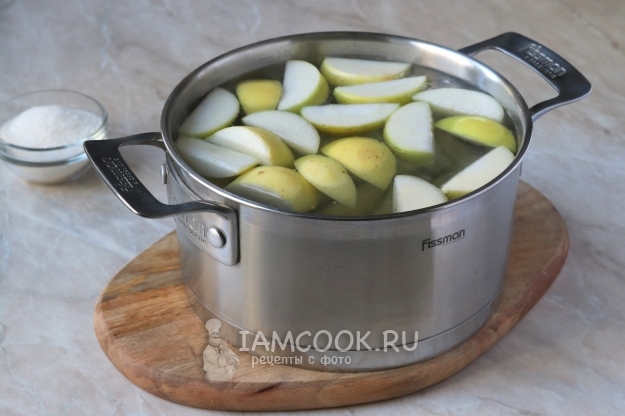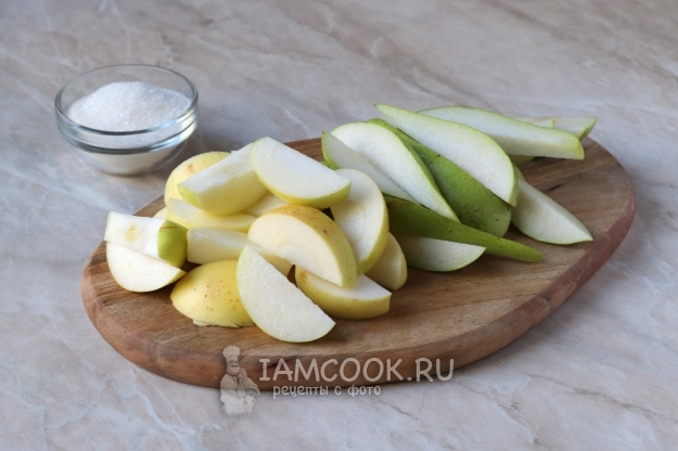 Первым делом отправить кастрюлю с водою на огонь и довести до кипения. Затем яблоки с грушами тщательно вымыть и обсушить бумажными салфетками. С помощью острого ножа нарезать их длинными дольками, удаляя семенную коробочку.
