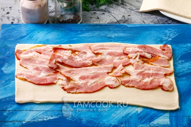 Взбейте куриное яйцо и смажьте им поверхность теста. Ломтики бекона выложите на слоеное тесто.