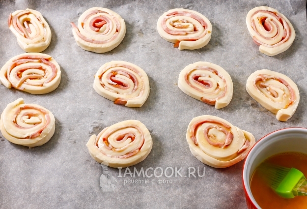 После застелите противень пергаментной бумагой и нарежьте рулет острым ножом, слегка обмакивая его в муку. Выложите заготовки на бумагу, смажьте взбитым яйцом и сразу же поместите противень в духовку на среднюю полку.