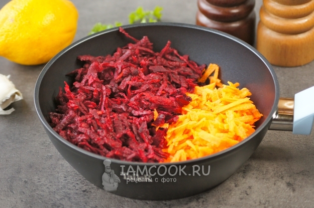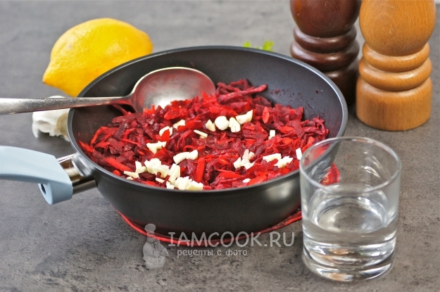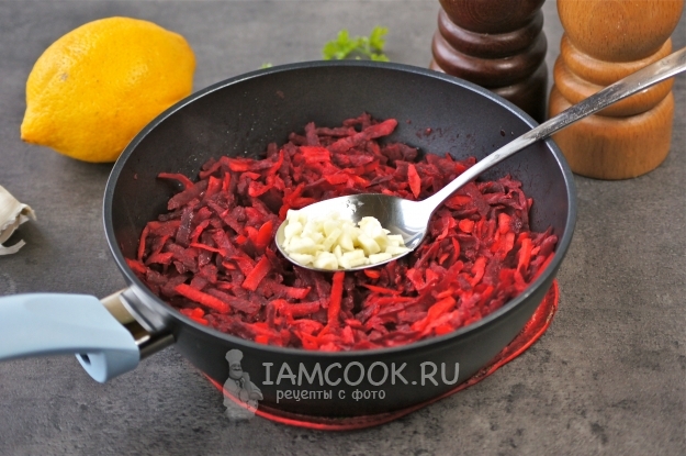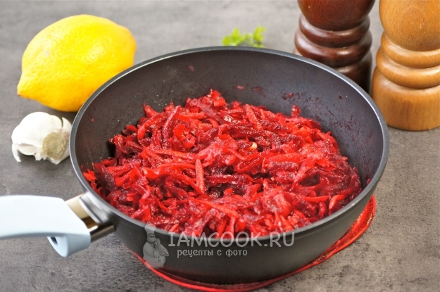 Натрите свеклу на крупной терке и выложите в сковороду, обжарьте, помешивая, на среднем огне около 5 минут.