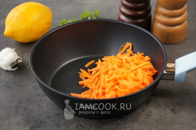 Вымойте и очистите овощи, морковь натрите на крупной терке и выложите в сковороду с растительным маслом.