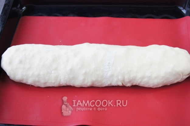 Сверните в рулет, переложите на противень, застеленный силиконовым ковриком или бумагой для выпечки.