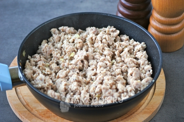 Добавьте фарш и обжарьте до полуготовности на среднем огне, посолите, поперчите по вкусу, остудите.