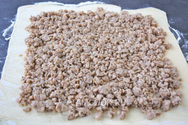 Выложите фарш и разровняйте ровным слоем, так, как показано на фото.