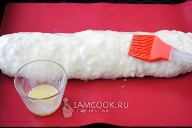 Смажьте рулет яичным желтком, удобно это сделать кулинарной кистью. Поставьте в разогретый до 190-200 градусов духовой шкаф на 35-40 минут, должна появиться румяная корочка.