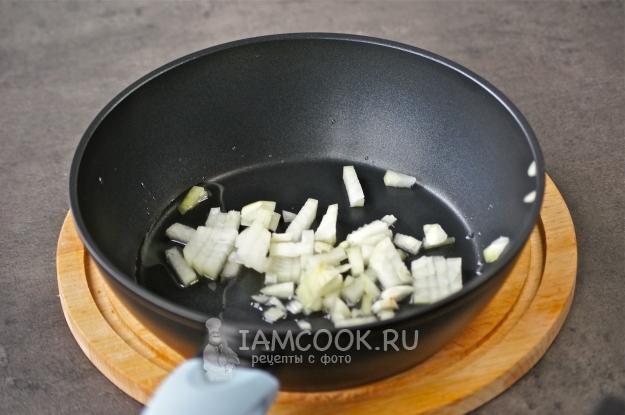 Для начала обжарьте рубленый лук на сковороде с растительным маслом до мягкости.