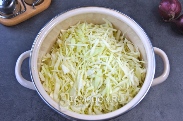 Для начала нашинкуйте капусту тонкой соломкой, выложите в кастрюлю, налейте 150 граммов воды, накройте крышкой и тушите на среднем огне минут 10. Это нужно для того, чтобы капуста размягчилась.
