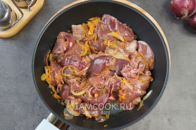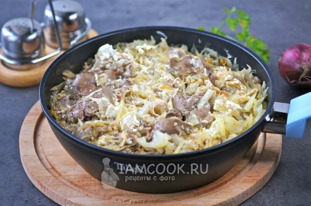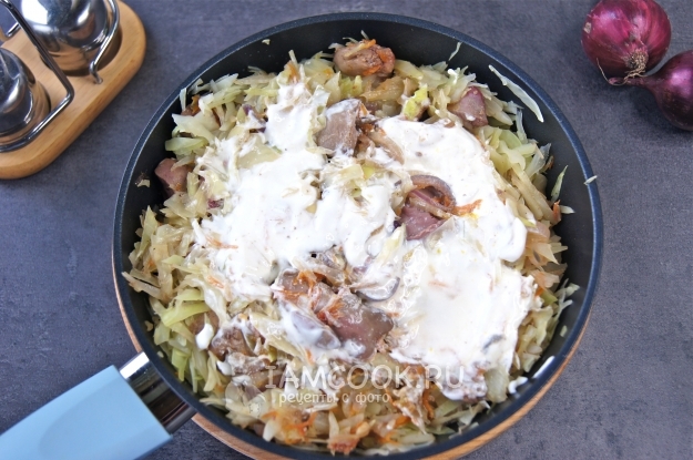 Добавьте сметану, влейте 150 миллилитров воды, накройте крышкой и тушите капусту с куриной печенью на умеренном огне около 25-30 минут.