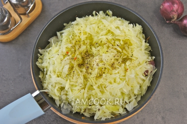 Выложите размягченную капусту, посолите, поперчите, добавьте любимые специи, перемешайте.