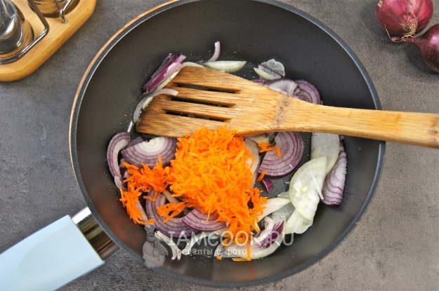 За это время очистите овощи, лук нарежьте полукольцами, морковь натрите и обжарьте на сковороде с растительным маслом до мягкости.
