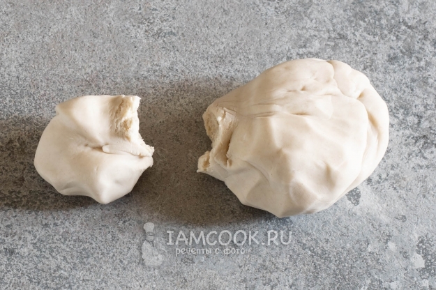 Разделяем тесто на 3-4 порции. Катать придётся очень тонко, имейте это в виду. Так что лучше брать кусочки поменьше. То тесто, которое в текущий момент не используется, следует хранить в плёнке.