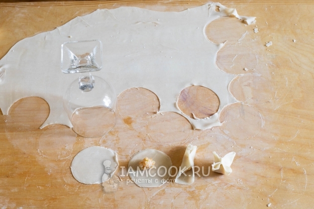 Ну, а дальше выбираем форму и начинаем лепить гёдзу. Повторяю, моя форма - только под приготовление на пару, потому что в ней - отверстия. Зато, по-моему, на вид - очень красиво. У кружочка попарно сжимаются края крест-накрест. Если вдруг чувствуете, что тесто слишком сухое и не клеится, его следует слегка смочить.