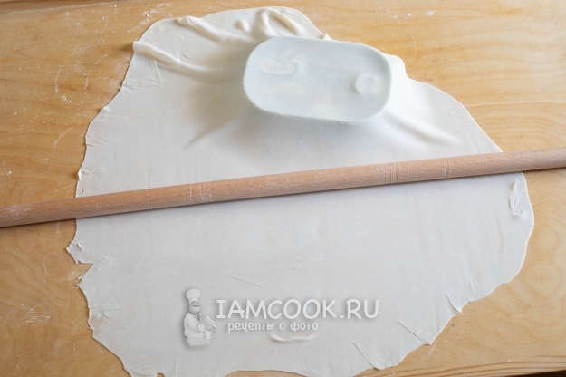 Посыпаем тесто крахмалом (кукурузным или рисовым) и раскатываем его как можно более тонко. Для этого удобнее всего использовать тонкую и длинную скалку. Крахмал подбавляем, не скупясь, хоть после каждой раскатки. Тесто должно скользить, как шелк, и в результате получиться реально прозрачным.