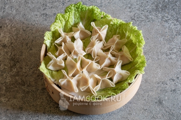 Поддон пароварки покрываем листьями пекинской капусты и выкладываем поверх них гёдзу. Конечно, лучше бы, чтобы она между собой соприкасалась как можно меньше.