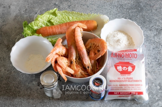 Креветки измельчаем и смешиваем с пекинской капустой, морковью и приправами. Приветствуются также проростки мунго, если они вдруг у вас есть.