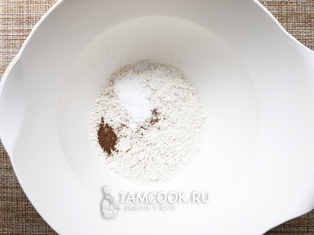 В глубокой миске соедините муку, корицу, разрыхлитель, щепотку соли и перемешайте.