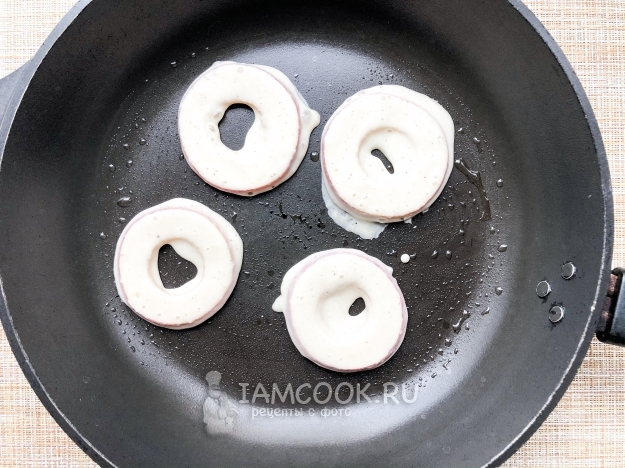 Разогрейте сковороду и смажьте ее подсолнечным маслом. Обмакните каждое яблочное колечко в тесто и обжаривайте на сковороде с обеих сторон до золотистой корочки на низком огне.