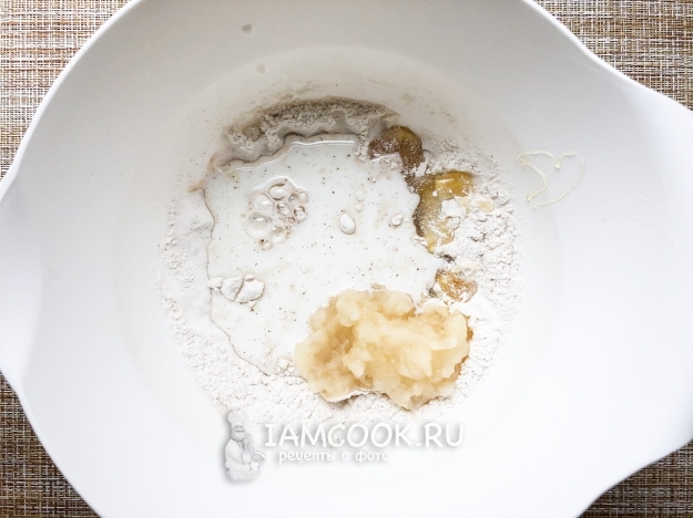 Добавьте молоко, мед и яблочное пюре. Перемешайте до однородной консистенции.
