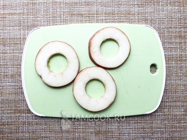 Яблоки нарежьте на тонкие колечки и вырежьте середину.