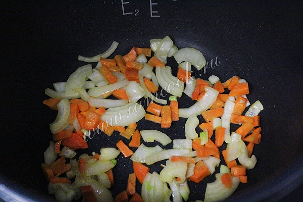 В чашу мультиварки нальем чайную ложку масла, добавим порезанные лук и морковь, включим режим"поджаривание" или "выпечка" и слегка обжарим овощи при открытой крышке.