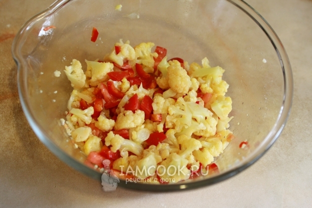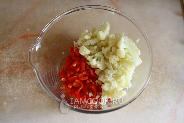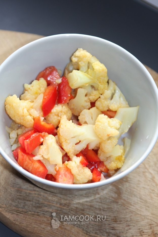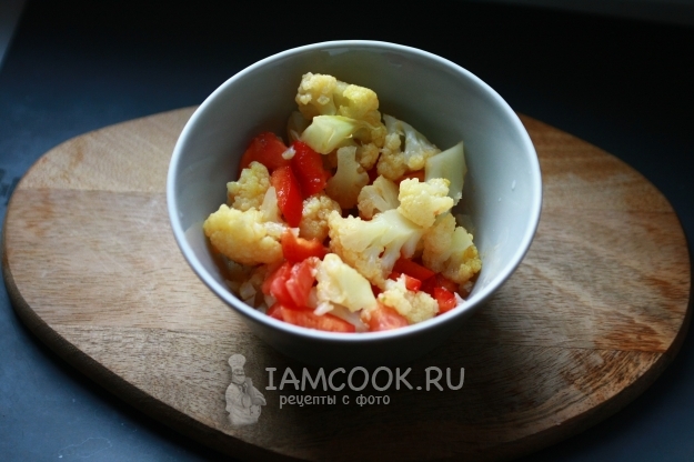 Выложить цветную капусту, помидор и сладкий перец в глубокую емкость.
