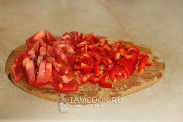 Пока варится капуста, мелко порежем сладкий перец и помидор.