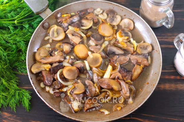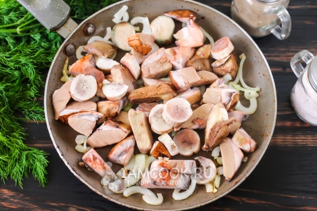 Промойте белые грибы, нарежьте их средними ломтиками и добавьте на сковороду. Помните, что сначала лук нужно немного обжарить, а не закладывать вместе с грибами, иначе он получится пропаренным, так как грибная нарезка сразу же выделит жидкость. Посолите массу.
