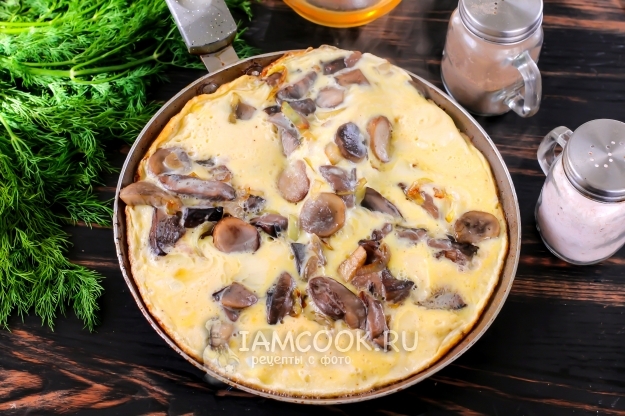 Залейте яичную смесь на обжаренные грибы и накройте сковороду крышкой. Уменьшите нагрев до минимального и томите омлет под крышкой около 5-7 минут до готовности. Он должен стать плотным.