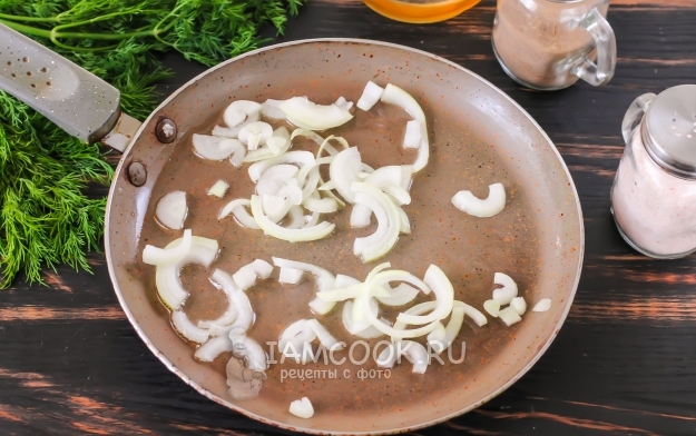Очистите от кожуры и промойте в воде репчатую луковицу, нарежьте ее полукольцами и пассеруйте в растительном масле на сковороде, включив умеренный нагрев. Вам потребуется около 2-3 минут.
