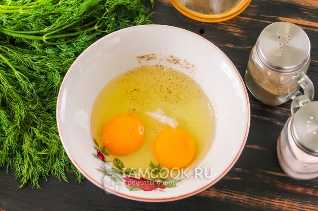 В глубокую емкость вбейте куриные яйца, посолите и поперчите их. Взбейте вилкой или венчиком.
