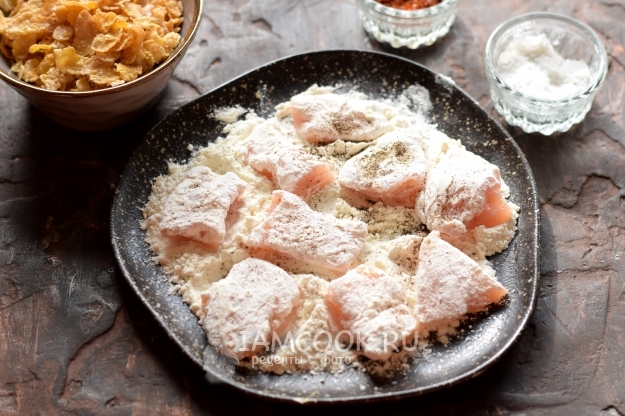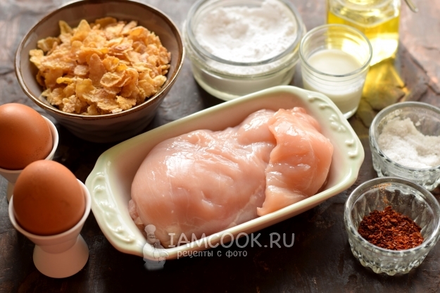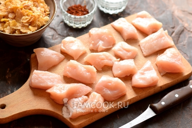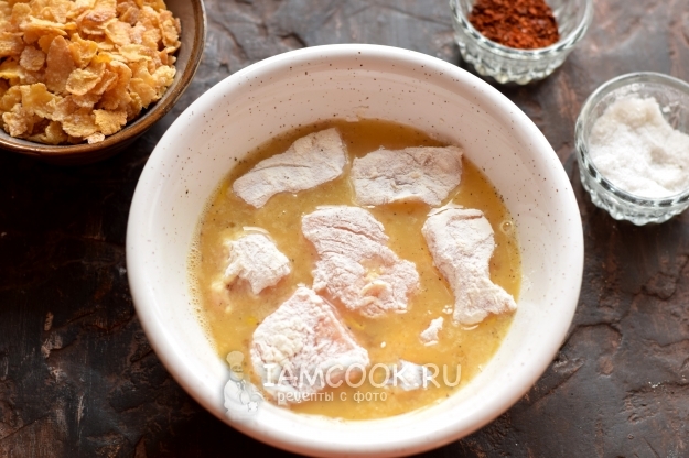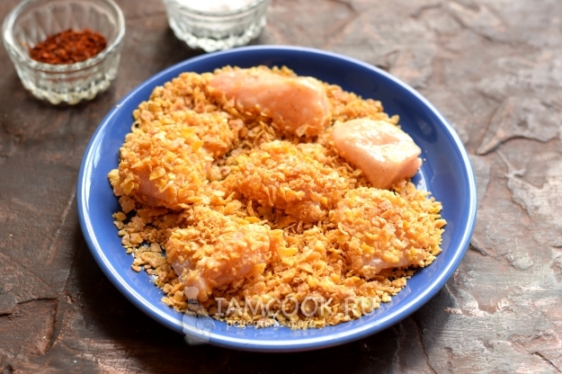 Далее курицу уложите в кукурузные хлопья, запанируйте в них со всех боков, не оставляя пробелов.