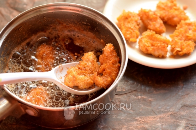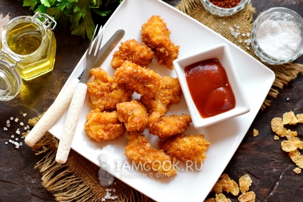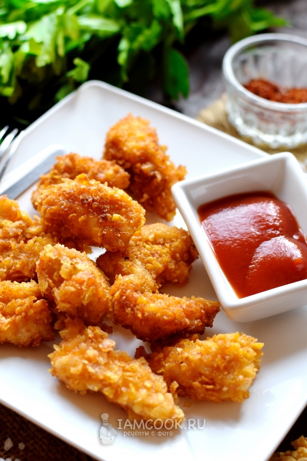 Куриные наггетсы, приготовленные в домашних условиях, станут отличной заменой фастфуду. Здесь можно постоянно экспериментировать с панировкой, каждый раз создавая разные вкусы. Например, из кукурузных хлопьев получается отменная панировка, интереснее панировочных сухарей. Куриные наггетсы в кукурузных хлопьях выходят мягкими и сочным внутри, имеют румяную и хрустящую корочку снаружи.