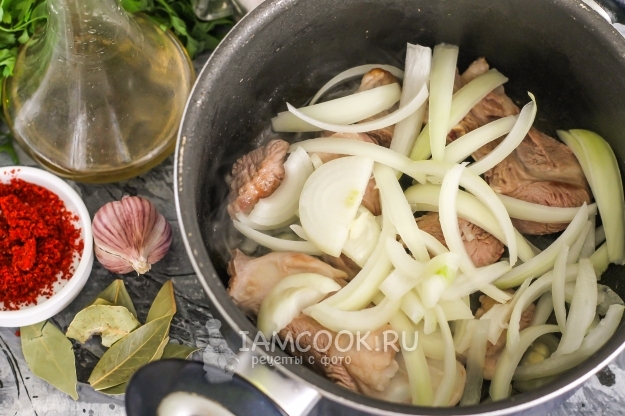 Переверните мясо на другую сторону, обжарьте до румяности. Очистите лук от шелухи, промойте в воде и нарежьте полукольцами. Выложите в емкость и обжарьте вместе с мясом около 2-3 минут.