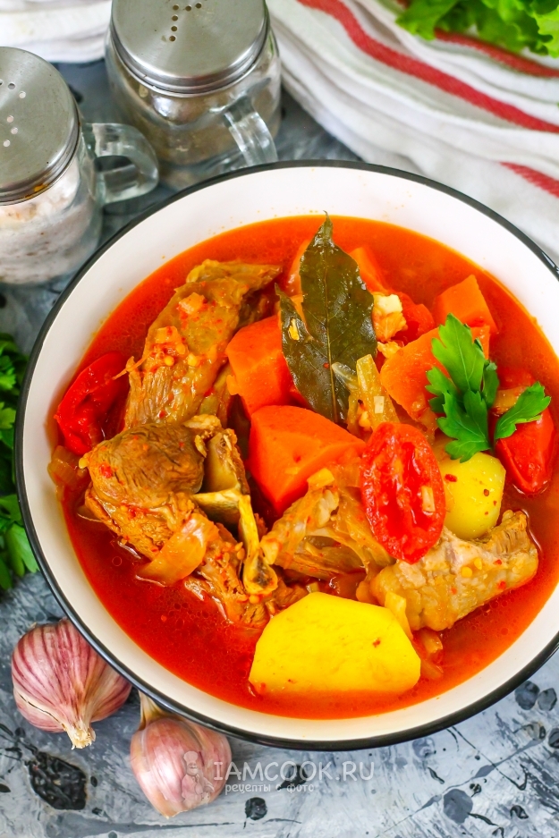 Каурма-шурпа - нечто среднее между первым и вторым блюдом. Она подается непременно горячей, так как готовится из баранины, и томится около 2-2,5 часов на минимальном нагреве. Лучше всего готовить такое блюдо в печи или на костре - аромат каурма-шурпы будет просто необыкновенным. Благодаря длительности варки мясо отстает от костей, становится нежным на вкус. Баранину обязательно приобретайте на кости, чтобы бульон получился вкусным и ароматным.