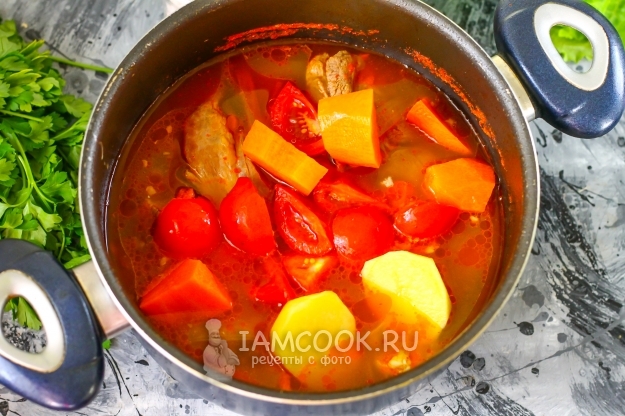 После этого всыпьте молотую паприку. Очистите от кожуры морковь и картофель, промойте вместе с томатами. Из томатов вырежьте сердцевинки. Нарежьте крупно все овощи или добавьте их целыми - шурпа не подразумевает мелкую нарезку продуктов. Томите под крышкой еще полчаса. Чеснок очистите от кожуры, промойте в воде и спрессуйте в емкость за 2-3 минуты до окончания варки.