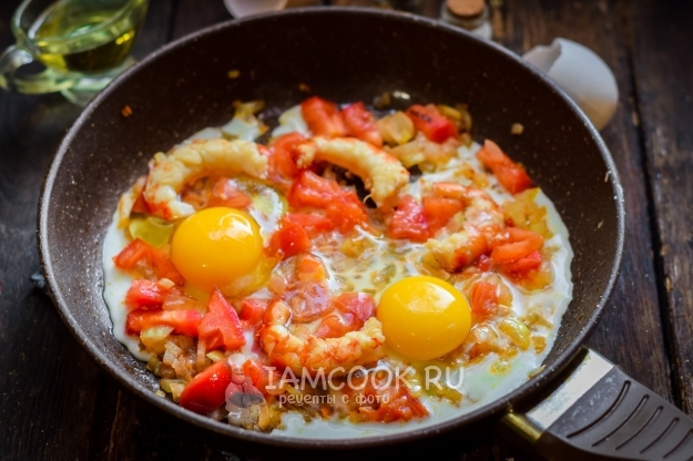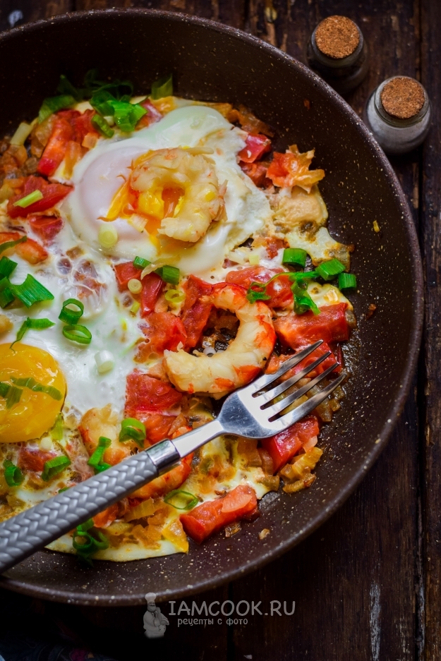 Яичница с креветками, приготовленная на завтрак, обед или ужин – это отличный вариант сытно и вкусно покушать. Креветок выбираем для рецепта покрупнее, обязательно добавим помидоры, немного лука и чеснок – все вместе дает просто идеальный результат. Для этого рецепта вы можете использовать разные специи и травы. Подавать к столу яичницу можно просто так, можно добавить тосты с авокадо или просто пару ломтиков хлеба, смазанных сливочным сыром.