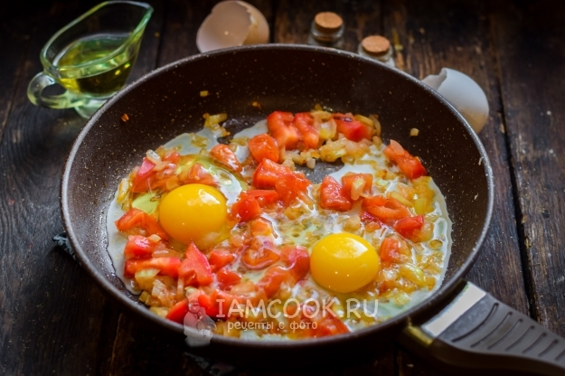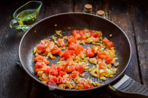 В сковороде прогреть немного растительного масла, выложить лук и чеснок, жарить пару минут. Добавить помидоры, готовить еще несколько минут, помешивая.