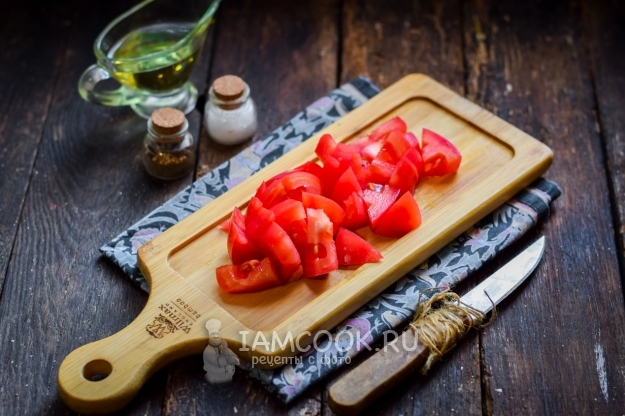 Помидоры также вымыть и просушить, удалить место роста плодоножки, нарезать помидор средними кубиками.
