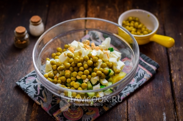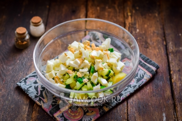 Куриные яйца очистить и нарезать аналогично предыдущим ингредиентам. Кубики яиц добавить также в салат.