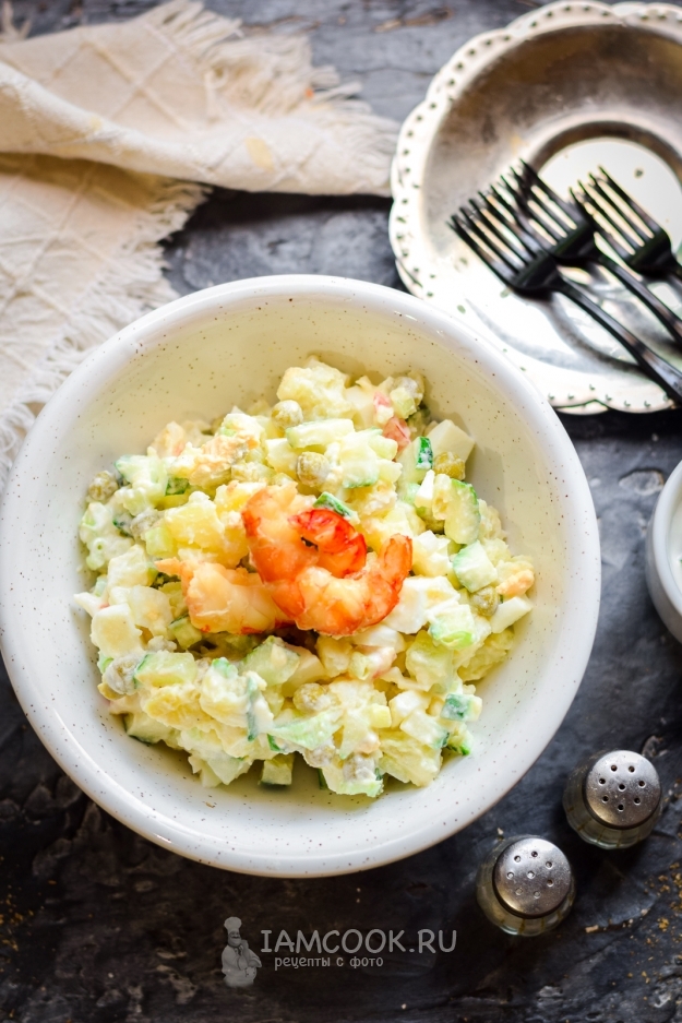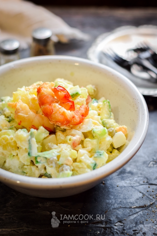 Салат «Оливье» с королевскими креветками – не оставит равнодушными ваших гостей, поверьте, салат понравится всем. Для рецепта понадобятся все ингредиенты, которые мы используем для традиционной версии салата, вот только квашеные огурцы заменим свежими - с креветками они сочетаются более гармонично. Заправку (майонез) по желанию заменить йогуртом или любым соусом.