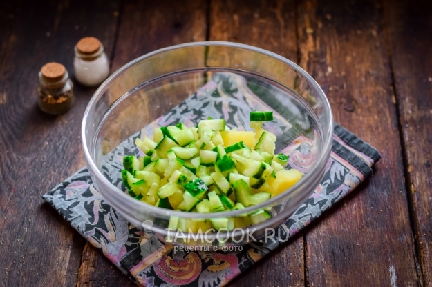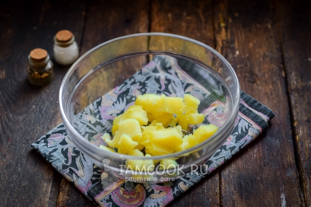 Очистить картофель, нарезать небольшими кубиками и переложить в салатник.