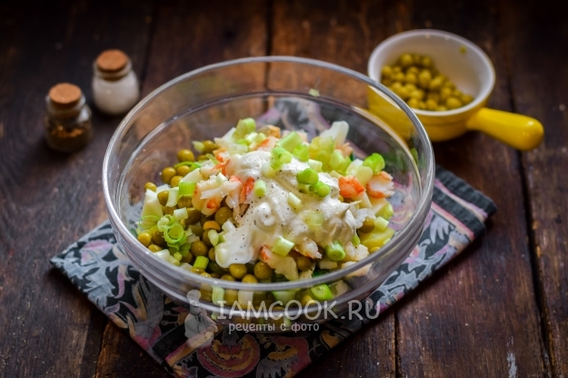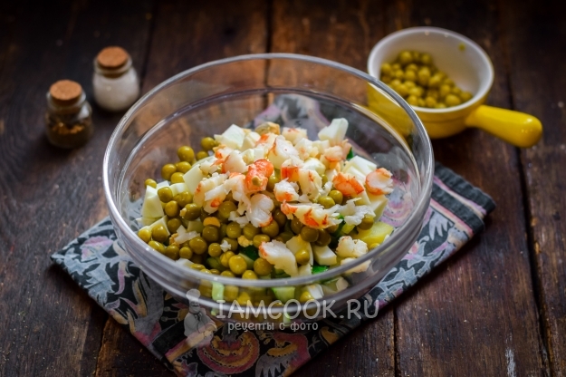 Вареных креветок очистить и нарезать. Переложить в салатник.
