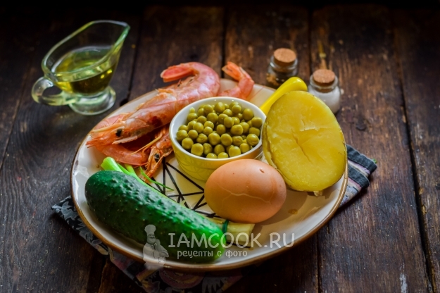 Подготовить все продукты по списку. Заранее отварить картофель, яйца и креветок.