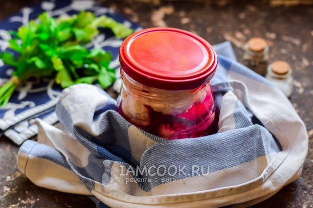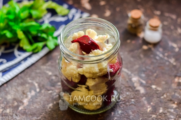 Вернуть маринад к овощам, сразу же закатать стерильной крышкой и поставить дном вверх. Укутать банку одеялом, оставить на сутки. Спустя время перенести закуску в кладовую. Маринованная цветная капуста со свеклой на зиму готова.