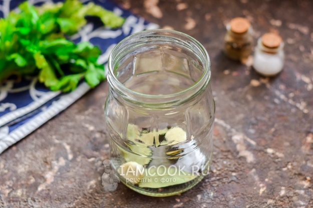 В стерильную банку уложить лавровый лист, перцы, очищенный чеснок.
