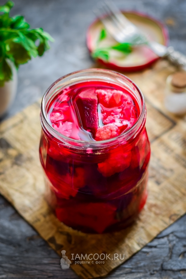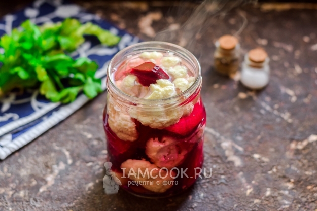 Маринованная цветная капуста со свеклой на зиму – это отличный вариант ароматной и вкусной закуски, которая подойдёт для любого застолья. Готовить закуску проще простого, здесь мы зальем ингредиенты дважды кипятком, после приготовим маринад. Никакой дополнительной стерилизации не будет, этот момент многим облегчает процесс. Подавать зимой капусту и свеклу можно с разными кашами, мясом, птицей и т.д.