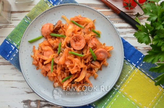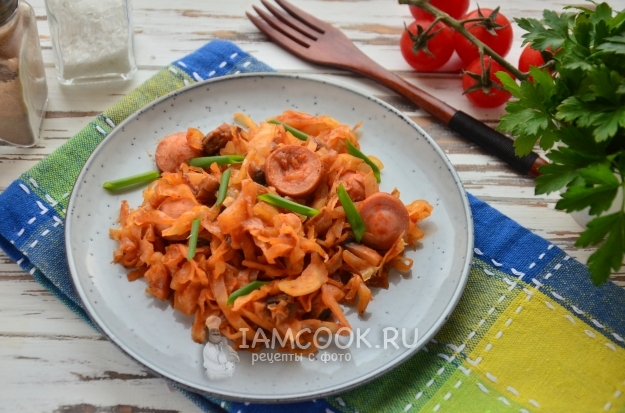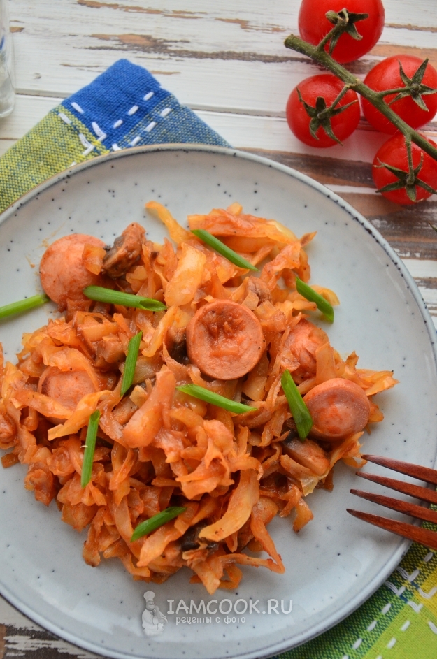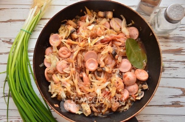 Перед подачей присыпьте тушеную капусту с сосисками и грибами рубленым зеленым луком, укропом или петрушкой.