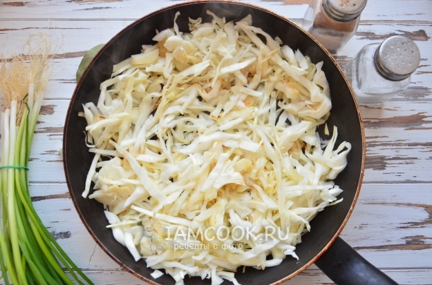 Раскалите растительное масло на сковороде. Отправьте обжариваться сначала капусту, сделав слабый огонь. Помешивайте и жарьте в течение 7-8 минут.
